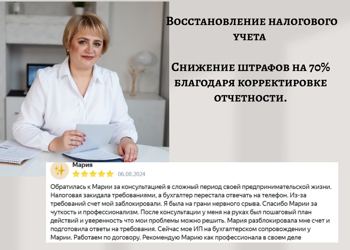 Обратилась в компанию "Деловое мышление" в сложный период своей предпринимательской жизни. Налоговая закидала требованиями, а бухгалтер перестала выходить на связь. Из-за требований мой счет заблокировали. Я была на грани нервного срыва. Спасибо Марии и компании "Деловое мышление" за чуткость и профессионализм. После консультации у меня на руках был пошаговый план действий и уверенность, что мои проблемы можно решить. Мне разблокировали счет и подготовили ответы на требования. Сейчас мое ИП на бухгалтерском сопровождении в компании "Деловое мышление", Работаем по договору. Сотрудничеством довольна.
